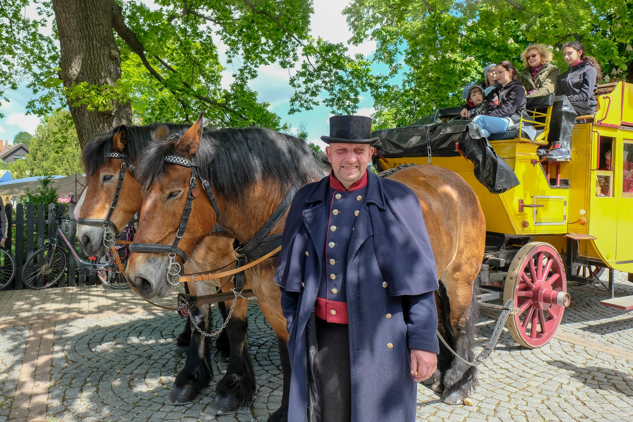 Während dessen klappert im Hintergrund eine große gelbe Postkutsche vorbei. Harald Rubow ist mit seiner Kutsche im Stil des ausgehenden 18. Jahrhunderts unterwegs. „Damit ist man früher um die 100 Kilometer am Tag gereist“, erklärt er, während er die drei westfälischen Kaltblüter füttert, die vor die Kutsche gespannt sind.