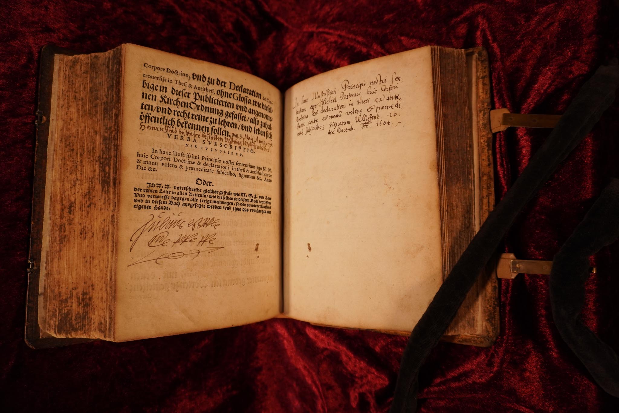 Umso spektakulärer ist die Neuerwerbung der Wolfenbütteler Kirchenordnung des Herzogs Julius von Braunschweig-Lüneburg von 1569 mit dem eigenhändigen Eintrag des Amtseides von Michael Praetorius aus dem Jahr 1604. Herzog Julius führte nach seinem Regierungsantritt 1568 die Reformation im Fürstentum ein, was mit der Veröffentlichung der Kirchenordnung offiziell vollzogen wurde. In erster Linie die geistlichen Amtsträger waren verpflichtet, einen Eid auf das hier niedergelegte Bekenntnis abzulegen. Dass auch Michael Praetorius dieses Gelöbnis in der Kirchenordnung abgab, betont seine herausragende Stellung am Hof von Heinrich Julius und seiner Gattin Elisabeth.